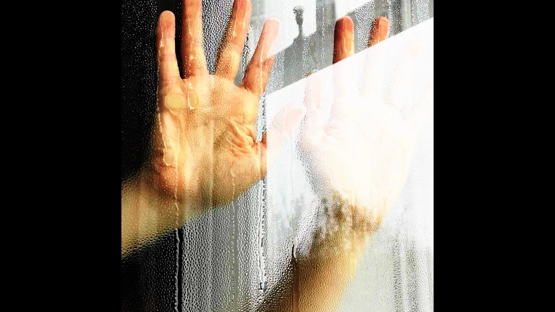 a woman with outstretched arms in front of a grey lake scene in the background.